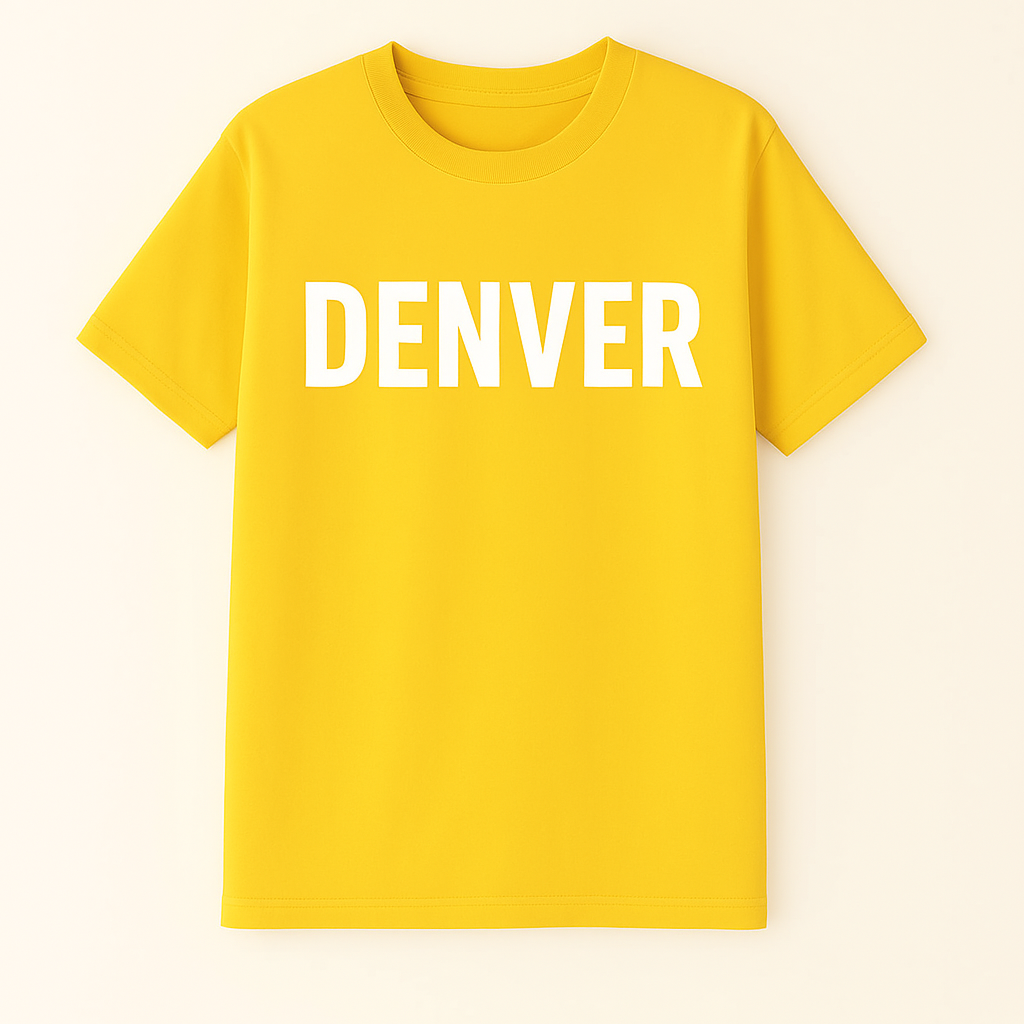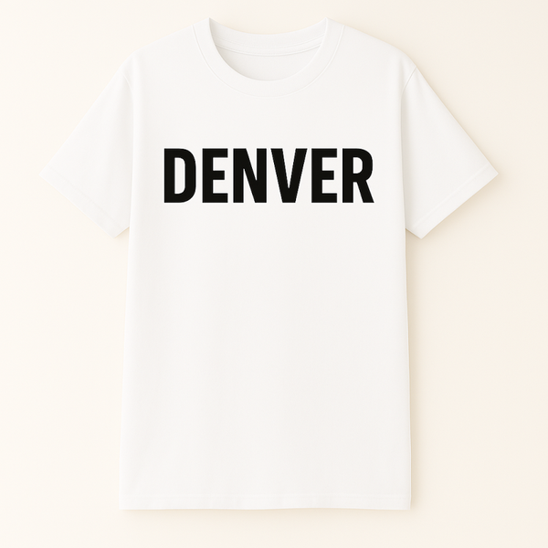🖤 This one’s all about city pride with a clean, classic punch. The black short-sleeve tee is 50/50 Poly/Cotton features bold white capital letters spelling out “DENVER” across the chest. It’s centered, crisp, and highly legible—no frills, just a proud shoutout to the Mile High City.