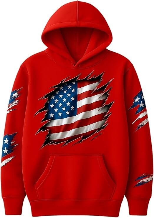 🔥 This hoodie delivers serious patriotic power with gritty style. It’s a sleek black pullover featuring a bold graphic across the chest: the American flag dramatically revealed through five jagged claw-like slashes. The effect makes it look as if the fabric was ripped open to expose the stars and stripes underneath—blue field of stars on the left, red-and-white stripes stretching across the slashes.